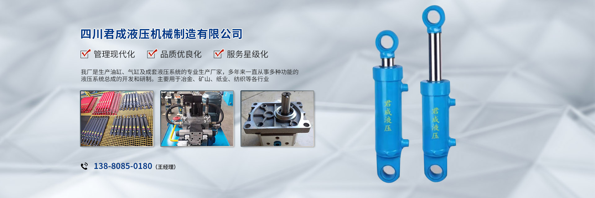 公司主導產品:液壓油缸HSG1全系列,YHG1型冶金設備缸,以及GHF1系列高壓液壓缸、多級缸等??蹓菏饺盗幸簤耗z管以及特殊要求的液壓膠管總成。公司銷售項目還包括各種管接頭、多路閥、液壓鎖、液壓系統、頂磚機、全液壓式垃圾庫等,承接各類大、中型成套液壓系統的設計制造、安裝和調試服務。